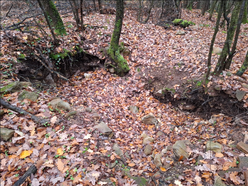 Produžio sam putem kroz šumu, za trenutak ga napustio i popeo se na blagi vrh Gradišta. Na samom vrhu i u njegovoj neposrednoj blizini, u krugu od nekih 100-200 m, nalazi se više dubokih iskopanih rupa: