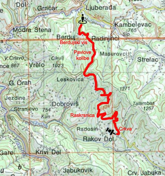 Dok sam u centru Ljuberađe čekao moje drugare da dođu iz Vlasotinca, razmišljao sam o činjenici da je relacija Ljuberađa - Crvena Jabuka, pomenutim putem, duga preko 25 km u jednom pravcu. Kada sam sistematski počeo da se bavim planinarenjem, 2009. godine, i kada sam sebi zacrtao cilj da obiđem svih 214 naseljenih mesta u Pirotskom okrugu, najveća nepoznanica mi je bila kako ću stići u pomenuta tri udaljena babušnička sela...