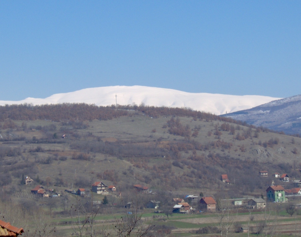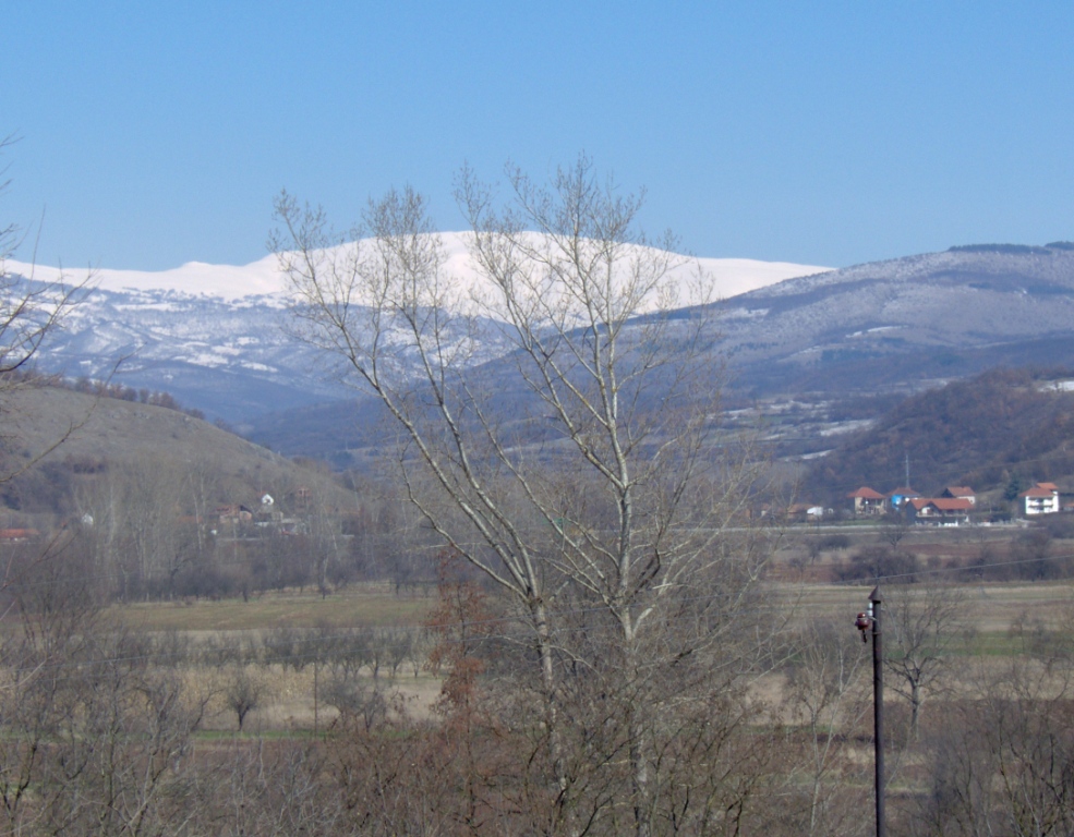 Kroz još gole grane drveća mogao sam da vidim Suvu planinu i Trem (1810 m) pod snegom: